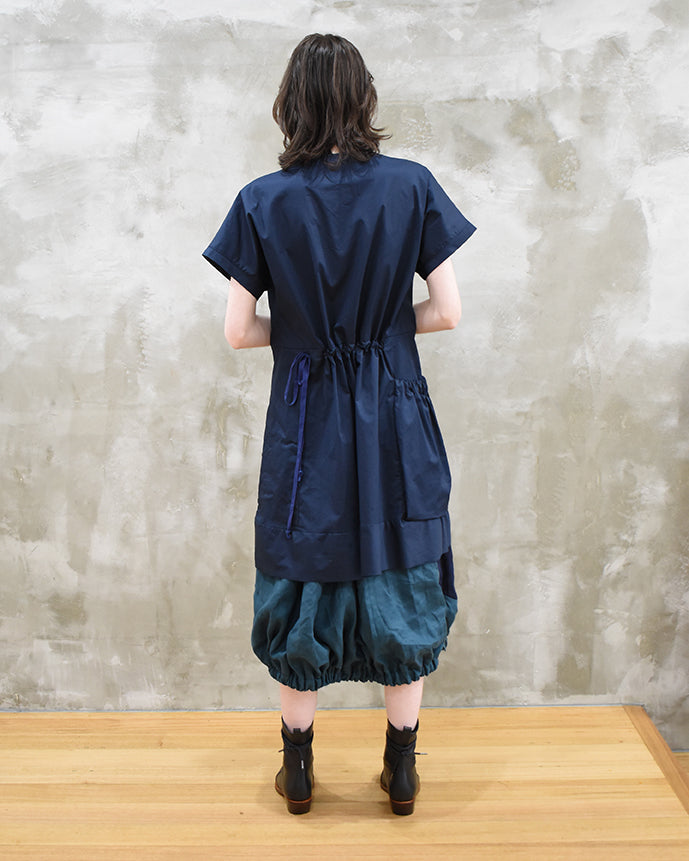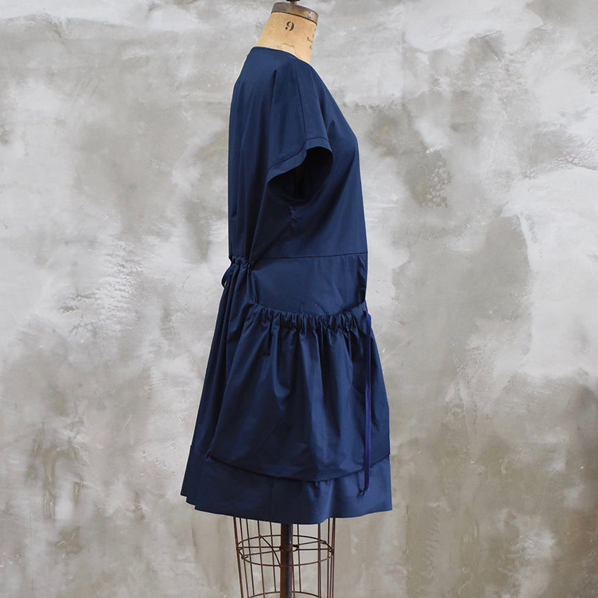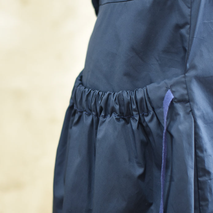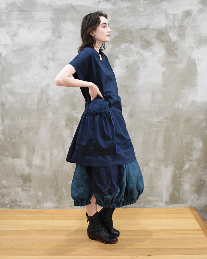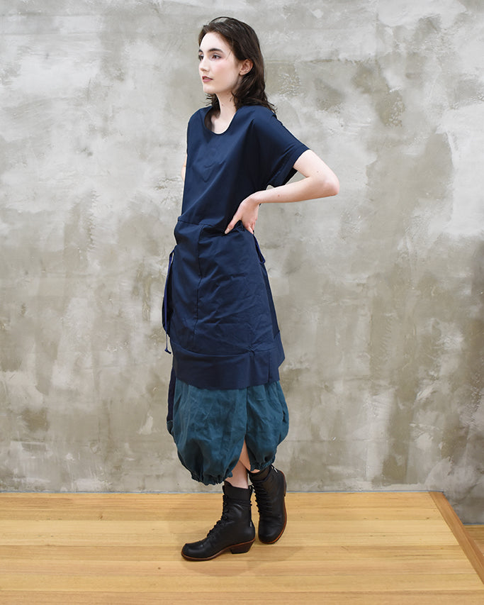 You're able to gather the back waist with the cotton ties to bring shape and texture to your look. Additionally the large gathered side pocket is a feature that can also be pulled in a little more with it's cotton tie and is big enough to hold your phone, keys, cards etc. while creating an interesting asymmetric textural statement.